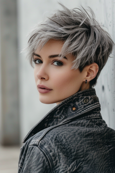 12♦️ Grauer Pixie-Schnitt mit abgehacktem Schnitt