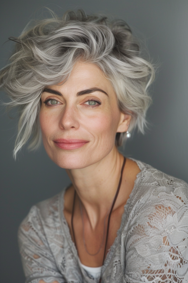 Dieser Pixie-Schnitt greift natürliche Wellen auf und kreiert einen weichen und romantischen Look. Die Wellen verleihen Bewegung und Struktur und machen ihn zu einem wunderschönen und femininen Style für graues Haar.