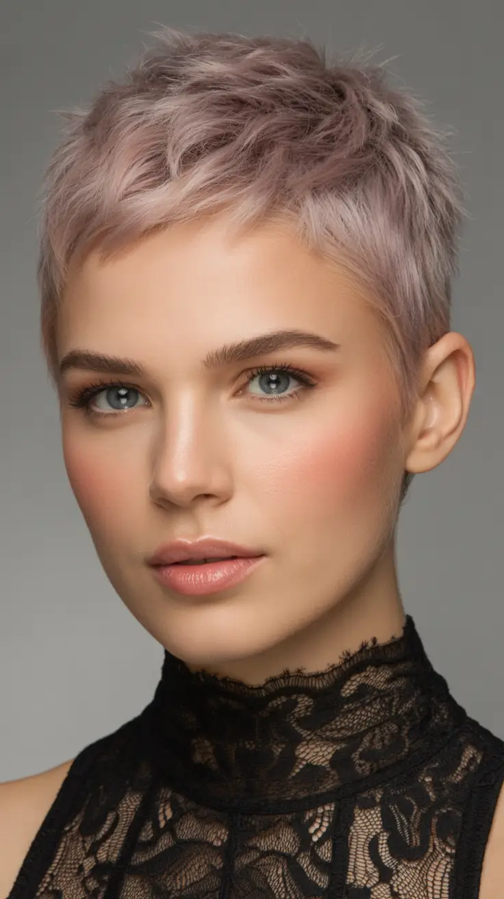 Dieser ultrakurze, leicht chaotische Pixie in einem hellen Lavendelgrau ist minimalistisch und dennoch sehr magisch. Die leicht kühlen Farbtöne verströmen eine ätherische Atmosphäre, obwohl der Gesamteindruck bodenständig und urban bleibt. Dieser Look wirkt mühelos, aber dennoch edgy und passt perfekt zur sanfteren Trendfarbe 2025.