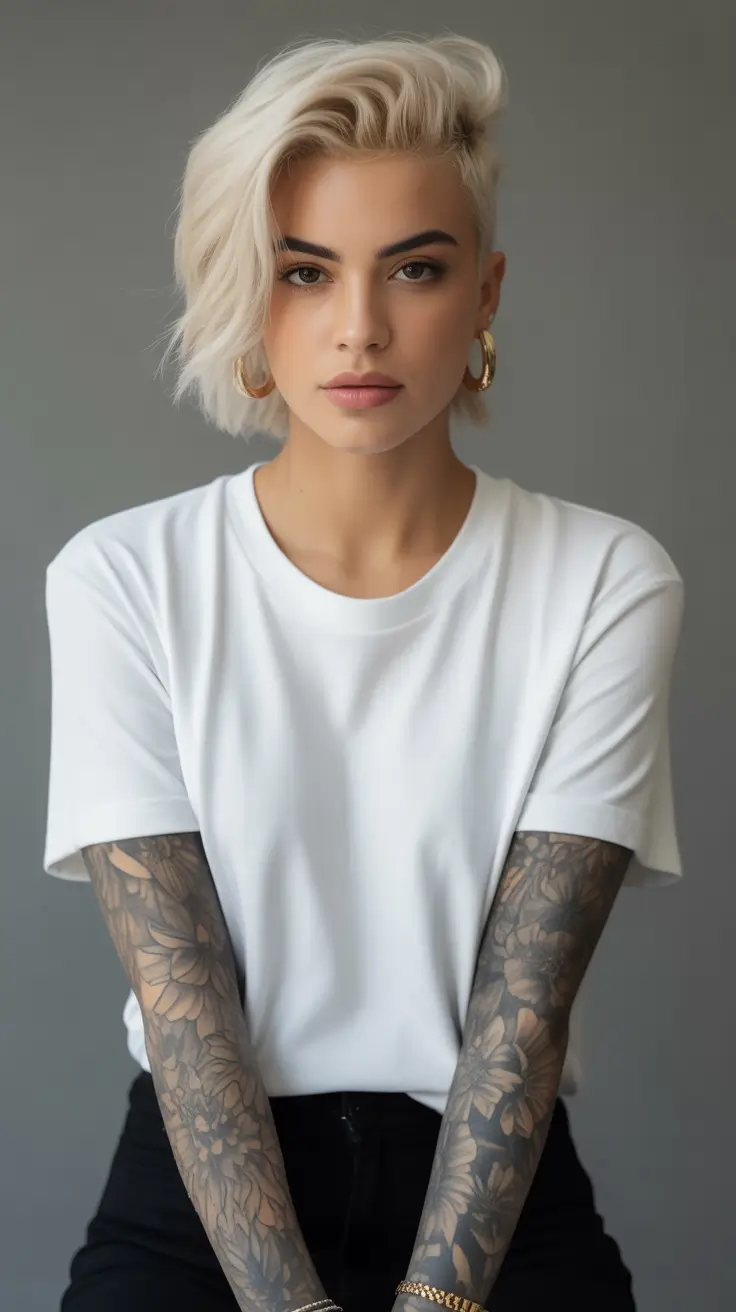 Dieser Pixie-Haarschnitt sprüht vor Dramatik, wo es darauf ankommt: Viele vom Wind zerzauste Längen, übertrieben dramatisch zur Seite geschwungen, bilden einen flauschigen Vorhang aus Platinseide. Die Ansätze sind ebenfalls dunkler gehalten und bieten gerade genug Schatten, um die Helligkeit auszugleichen. Dieser Schnitt definiert Eleganz mit Kante neu. Er ist der ultimative Pixie-Haarschnitt für den Herbst – leuchtend in der Farbe, süß und sexy in der Form.