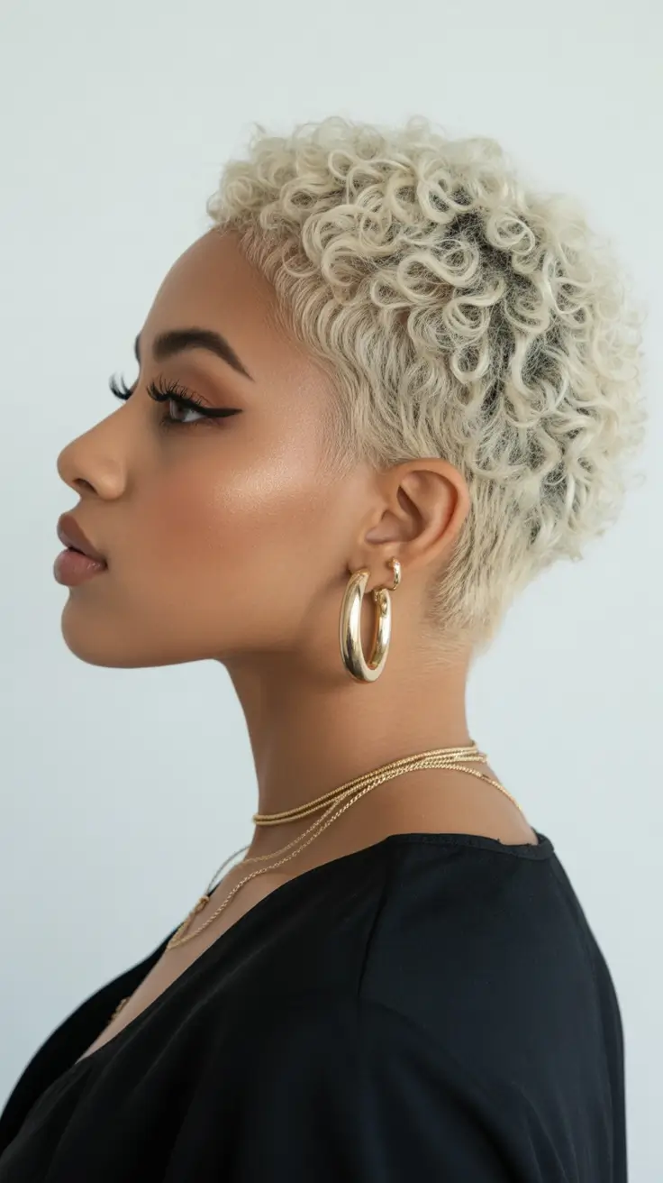 Ein echter Hingucker. Frauen mit 4c-Locken lieben diesen Kurzhaarschnitt, weil er die 4c-Locken perfekt umschließt und umrahmt. Die blonde Farbe wirkt nicht matt, sondern gelblich wie Honig auf strahlender Haut. Sie bildet einen wahren Heiligenschein um den Kopf und ist einer der mutigsten und zugleich weichsten Pixie-Haarschnitte des Herbsts.