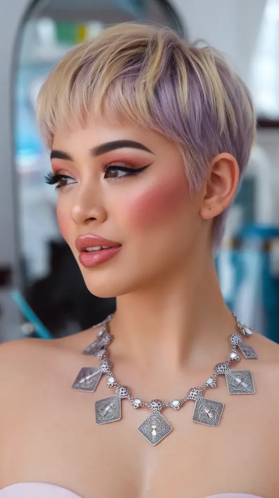 Dieser Pixie-Schnitt zeichnet sich durch eine blonde Basis mit zarten lavendelfarbenen Highlights aus und kreiert einen weichen und verspielten Look. Die ungleichmäßigen Stufen und der feine Pony verleihen Struktur und passen wunderbar zu feinem Haar.