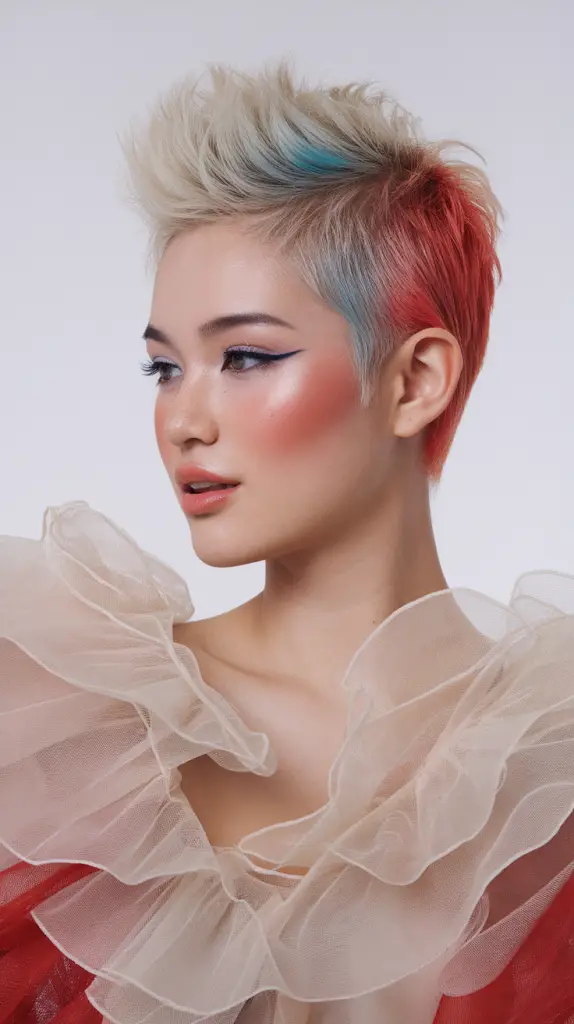 Dieser trendige Pixie-Schnitt besticht durch eine lebendige Mischung aus Blond-, Rot- und Blautönen und einer markanten, vom Irokesenschnitt inspirierten Form. Die strukturierten Spitzen und der markante Undercut sorgen für Dramatik und Individualität.