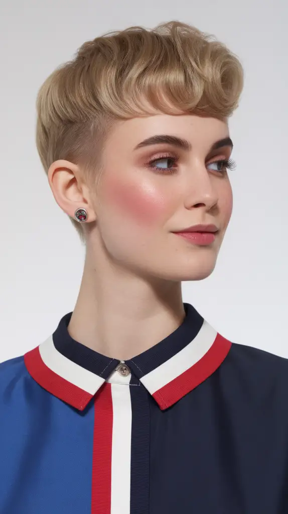 Dieser trendige Pixie-Schnitt kombiniert einen geschwungenen Pony und strukturierte Stufen für einen markanten und zugleich raffinierten Style. Die Kombination aus Volumen oben und kurz geschnittenen Seiten sorgt für eine einzigartige und trendige Silhouette.