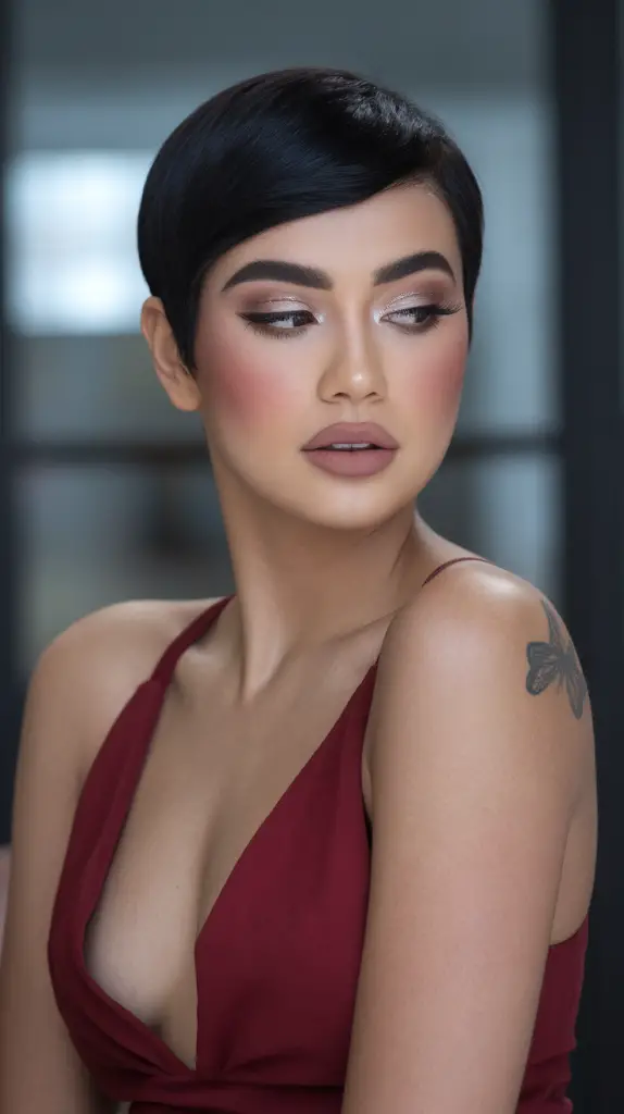 Dieser Pixie-Schnitt besticht durch einen glänzenden Schwarzton mit einem scharfen Seitenscheitel für einen glatten und eleganten Look. Das glatte Styling verleiht Eleganz und betont die klaren Linien des Schnitts.