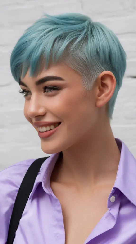 Dieser asymmetrische Pixie-Schnitt besticht durch einen kräftigen Himmelblau-Ton mit einem sanften Undercut für zusätzliche Schärfe. Der gestufte Schnitt verleiht Struktur und Bewegung und ist somit ideal für einen trendigen, modernen Look.