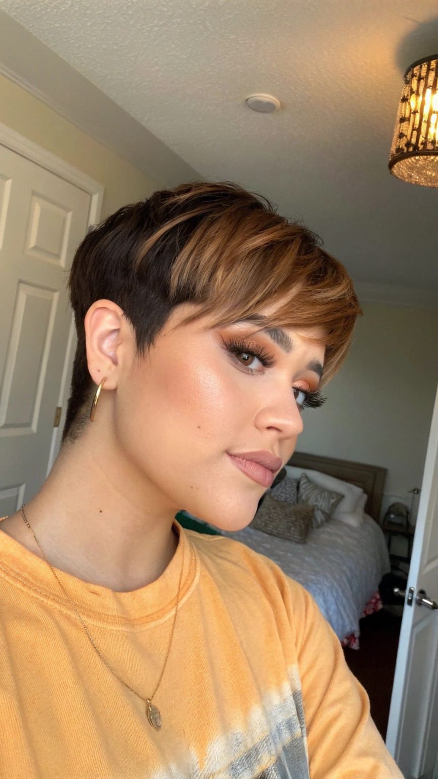 12. Golden Hour Glow: Weicher Pixie mit seitlichem Pony