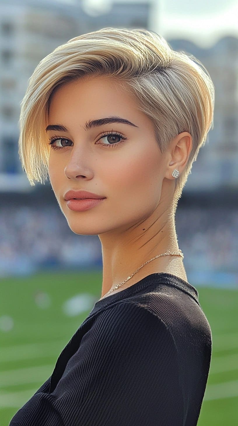 Blond und gewagt: Dieser Schnitt kombiniert Struktur mit mühelosem Charme. Der glatte Undercut sorgt für Modernität, während die längeren Schichten oben für Styling-Vielseitigkeit sorgen. Egal, ob Sie ihn für eine Veranstaltung schick machen oder lässig fallen lassen, dies ist der ultimative Sommerschnitt für coole Mädchen.