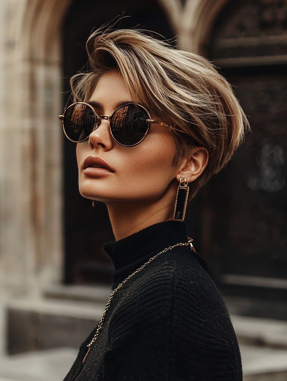 Wenn James Bond 2026 eine Hauptdarstellerin mit Pixie-Schnitt hätte, wäre es diese. Cool, selbstbewusst und ein wenig geheimnisvoll – dieser Look setzt auf scharfe Winkel und weiche Abschlüsse. Der seitlich geschwungene Pony verleiht feinem Haar sofortiges Volumen, während der dunklere Ansatz ihm zusätzliche Tiefe verleiht. Bonus: Er passt perfekt zu auffälligen Accessoires und einem Espresso in der Hand.
