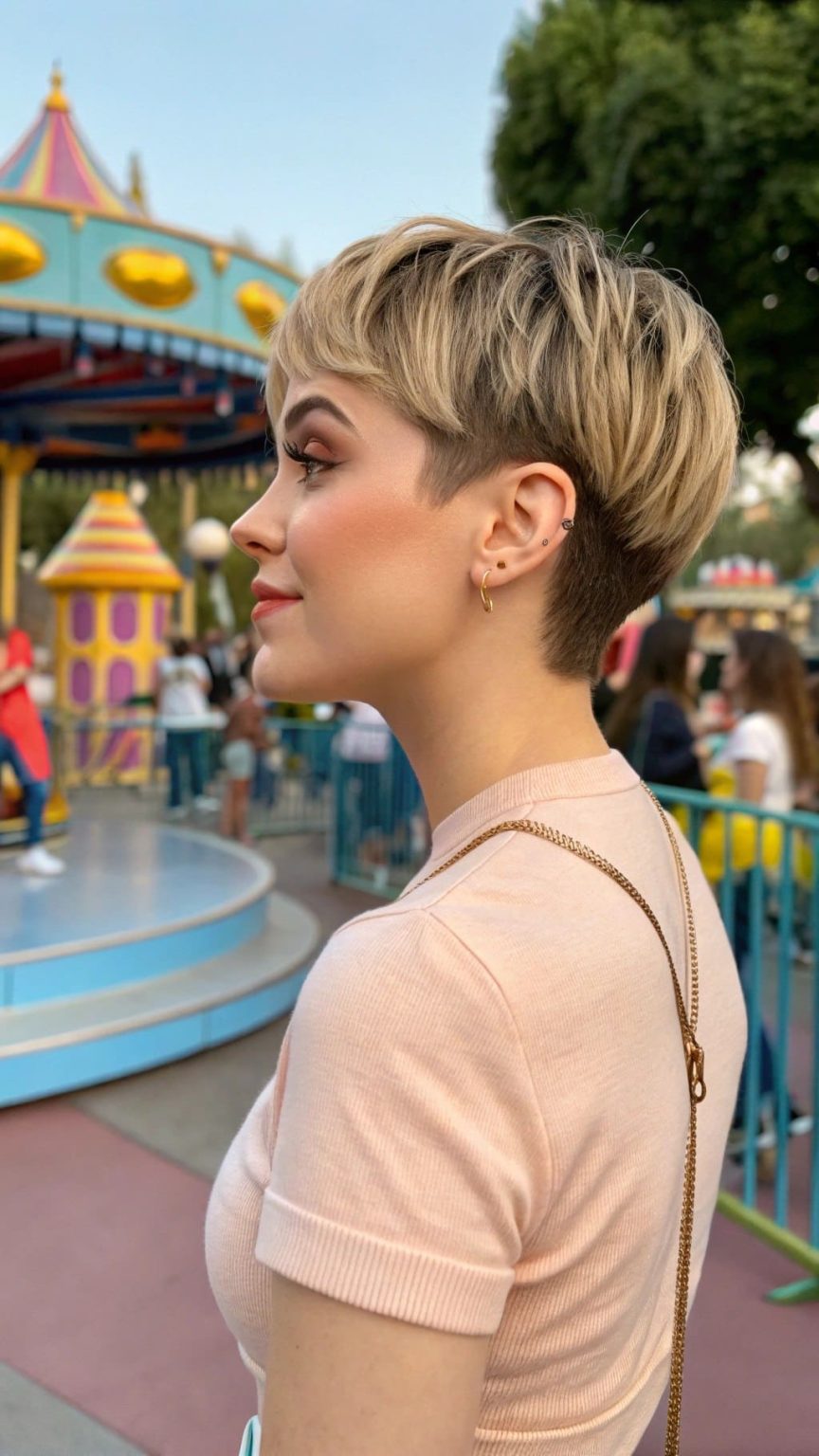Dieser Schnitt ist wie ein Sommermärchen – leicht, mühelos und ein bisschen schelmisch. Der kurze Hinterkopf und die längeren Stufen oben machen ihn ideal für feines Haar, während die warmen Blondtöne sonnig wirken. Ob auf dem Jahrmarkt oder beim Erledigen von Besorgungen – dieser lange Pixie sorgt für Spaß und Frische. Und mal ehrlich: Wer wünscht sich nicht einen Haarschnitt, der einem die ganze Arbeit abnimmt?