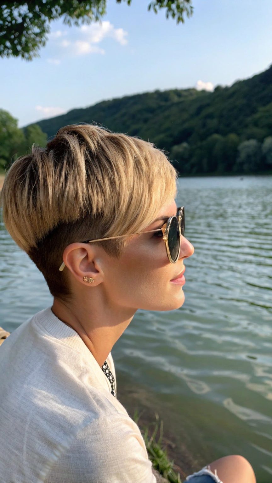 Stellen Sie sich Folgendes vor: Ein Sonnenuntergang am Seeufer, der Wind in Ihren Haaren und ein Pixie-Schnitt, der schreit: „Ich lebe mein bestes Leben.“ Dieser blonde, zerzauste Stil mit Undercut sorgt für Leichtigkeit und Luftigkeit, perfekt für dickes Haar, das im Sommer etwas Erleichterung braucht. Sonnenbrille auf, Stimmung hoch und auf zu einem neuen Abenteuer – denn dieser Schnitt ist wie gemacht für unbeschwerte Momente.