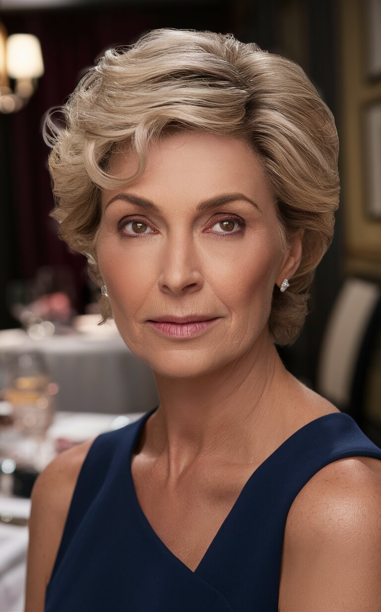 Dieser elegante, lockige Bob ist perfekt für Frauen über 50, die einen anspruchsvollen und dennoch modernen Stil suchen. Die weichen Locken verleihen Volumen und Bewegung und eignen sich ideal für ovale Gesichtsformen. Stellen Sie sich diesen Look bei einem formellen Abendessen vor, bei dem die Locken das Gesicht perfekt umrahmen. Die platinblonde Farbe verleiht einen Hauch von Glamour und sorgt dafür, dass Sie sich rundum wohlfühlen und gut aussehen. Diese Frisur ist perfekt für besondere Anlässe und verleiht ein raffiniertes und elegantes Aussehen, das zeitlos und schick zugleich ist.