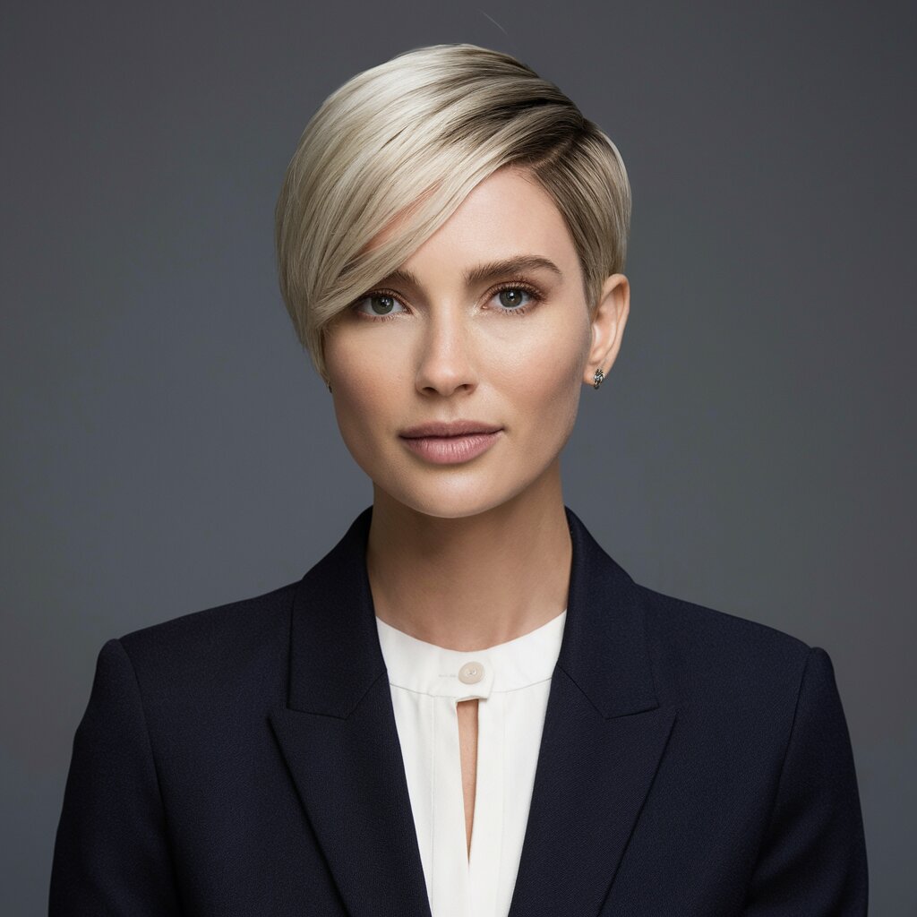 Dieser professionelle Platin-Pixie-Schnitt ist perfekt für einen eleganten und eleganten Look. Ideal für Frauen mit runden Gesichtsformen zeichnet sich dieser Stil durch klare, scharfe Linien aus, die einen anspruchsvollen Look kreieren. Stellen Sie sich diesen Schnitt in einem Büro vor, kombiniert mit einem maßgeschneiderten Anzug. Die platinblonde Farbe verleiht einen modernen und eleganten Touch und sorgt für einen professionellen und stilvollen Look. Dieser Schnitt ist perfekt für alle, die eine pflegeleichte und dennoch schicke Frisur wünschen.