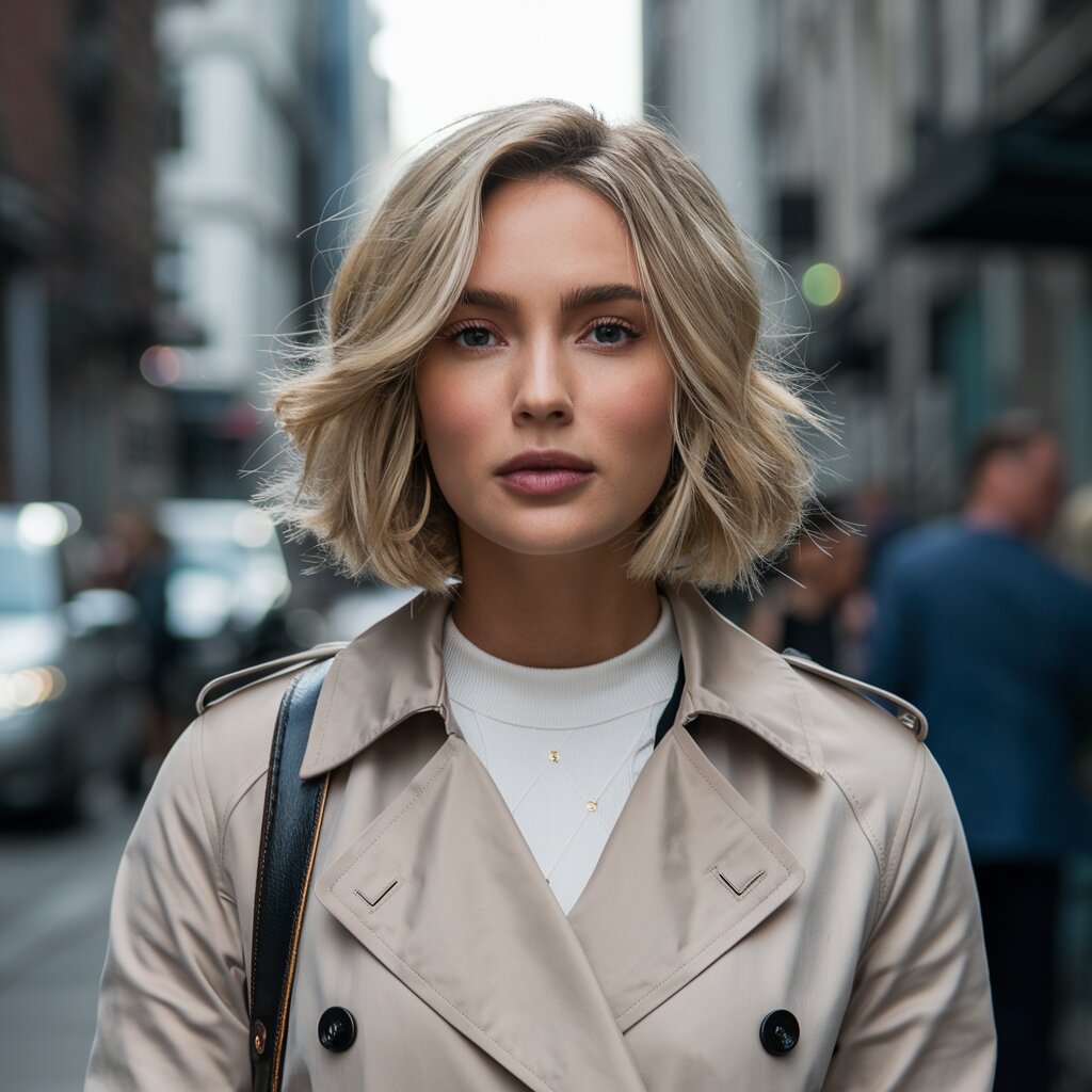 Ein zerzauster blonder Bob für mühelose Coolness. Die leicht verwuschelten Wellen verleihen diesem Style eine lässige und dennoch stylische Ausstrahlung – perfekt für einen geschäftigen Tag in der Stadt. Dieser Schnitt passt am besten zu ovalen oder herzförmigen Gesichtern und verleiht Textur und Volumen, wodurch er ideal für feines Haar ist. Stellen Sie sich vor, Sie schlendern durch belebte Straßen, tragen einen schicken Trenchcoat und ein entspanntes Lächeln und ziehen alle Blicke auf sich.