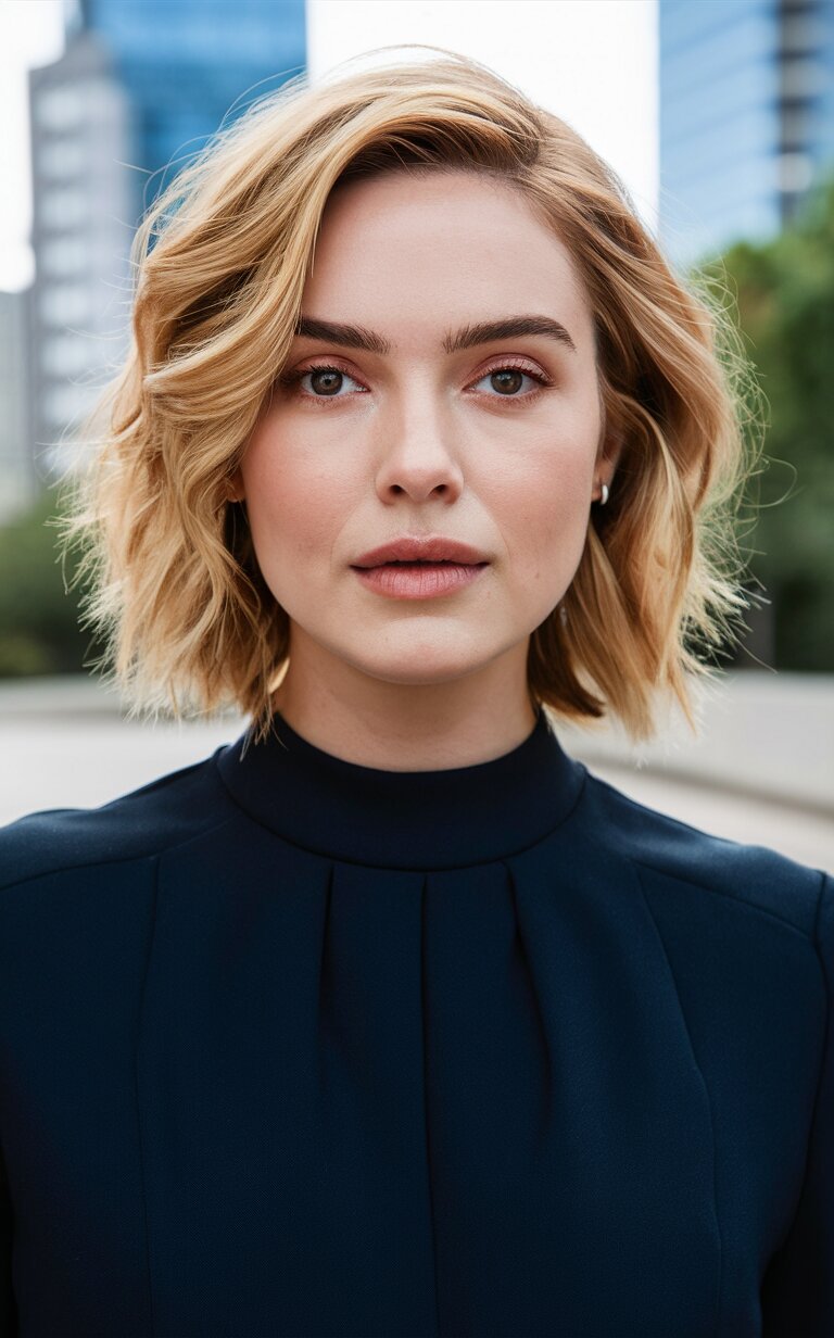 Suchen Sie einen dezenten und dennoch raffinierten Kurzhaarschnitt? Dieser dunkelblonde, wellige Bob ist eine ausgezeichnete Wahl, besonders für feines Haar. Die sanften Wellen verleihen Volumen und Struktur und sorgen für einen volleren Look, während die dunkelblonde Farbe für Wärme sorgt. Dieser Stil passt gut zu ovalen oder runden Gesichtsformen und sieht mit einer klassischen marineblauen Bluse fantastisch aus – für ein professionelles und dennoch stilvolles Erscheinungsbild. Stellen Sie sich diese Frisur in einem Büro vor, wo die dezente Eleganz die schlichte, moderne Umgebung perfekt ergänzt. Sie ist der perfekte Style für Kunden, die einen raffinierten, mühelosen Look wünschen.