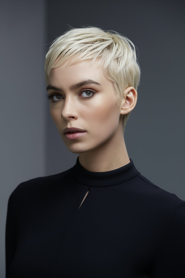 Für alle, die sich eine glatte und auffällige Kurzhaarfrisur wünschen, ist der weißblonde Pixie mit spitzem Pony eine mutige Wahl. Dieser Style verleiht eine moderne Note und sieht fantastisch zu einem minimalistischen schwarzen Kleid aus – ideal für formelle Anlässe oder einen Abend in der Stadt. Er schmeichelt ovalen oder herzförmigen Gesichtern und betont die Konturen. Diese Frisur ist besonders beliebt bei meinen Kunden, die eine gewagte und dennoch schicke Verwandlung suchen. Stellen Sie sich diese Frisur in einem modernen, stilvollen Ambiente vor, in dem die Kühnheit der Haarfarbe und des Schnitts wunderbar zur Geltung kommt.