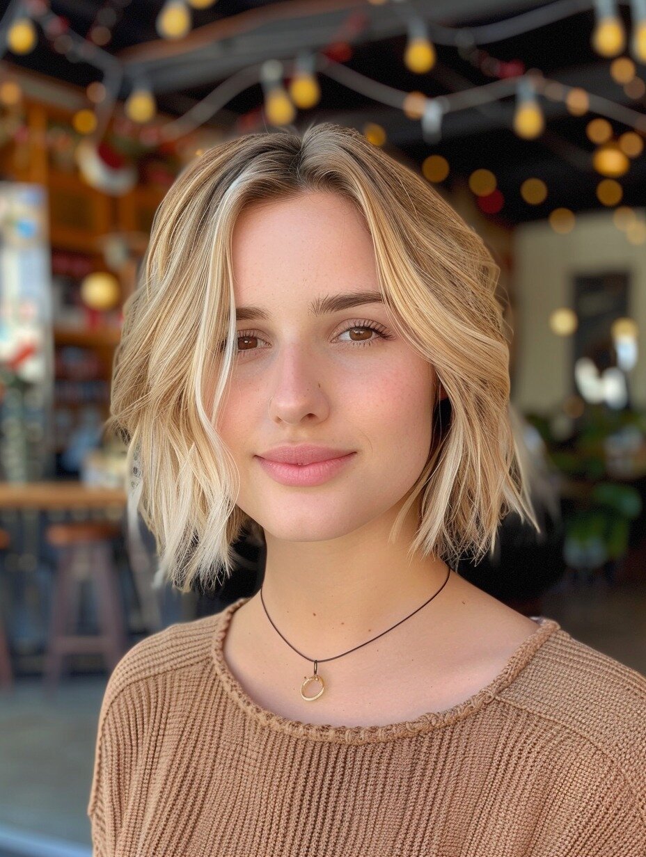 Sie suchen einen verspielten und dennoch raffinierten Kurzhaarschnitt? Dieser blonde Bob mit dezenten Highlights ist perfekt für einen frischen und jugendlichen Look. Die weichen, gestuften Wellen verleihen Bewegung und Dimension und machen ihn zu einer hervorragenden Wahl für feines Haar. Kombinieren Sie ihn mit einem lässigen Pullover in Erdtönen für einen entspannten und dennoch stilvollen Look – ideal für einen Wochenendbrunch oder einen Spaziergang durch ein charmantes Caféviertel. Dieser Look passt zu ovalen oder herzförmigen Gesichtern und ist seit jeher ein Hit bei Kunden, die einen vielseitigen und lebendigen Stil suchen.
