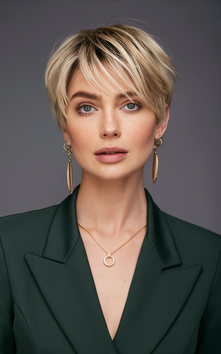 Dieser moderne Pixie-Schnitt mit hellblonden Highlights ist perfekt für Frauen mit runder Gesichtsform. Die dezenten Highlights verleihen dem Style Dimension und Struktur und lassen ihn hervorstechen. Stellen Sie sich diesen Look in einem schicken Stadtrestaurant vor, wo die klaren Linien des Pixie-Schnitts ein elegantes Outfit ergänzen. Die hellblonde Farbe sorgt für eine jugendliche und frische Ausstrahlung – ideal für alle, die ihren Look verjüngen möchten. Dieser Schnitt ist schick, pflegeleicht und perfekt für einen aktiven, modernen Lebensstil.