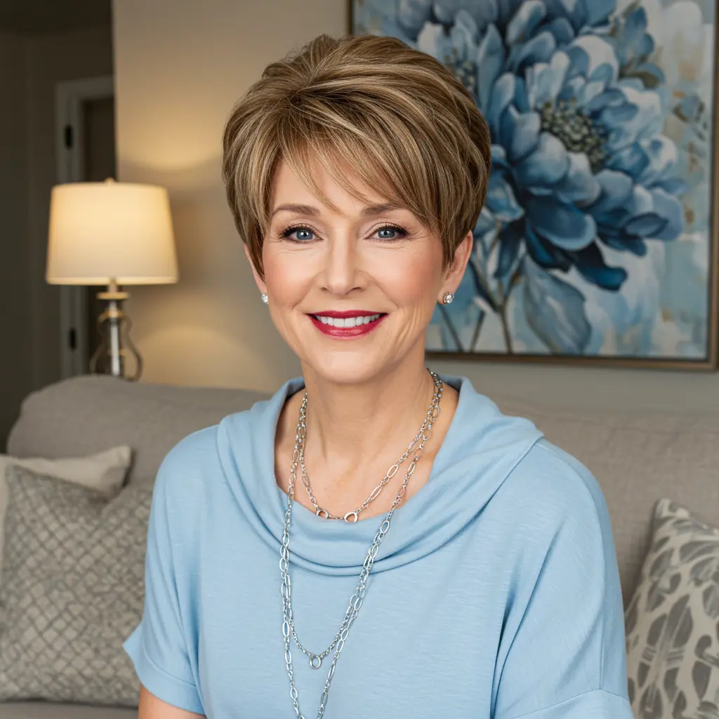 Dieser altersgerechte kurze Pixie-Schnitt verbindet klassische Eleganz mit modernem Charme und kreiert einen raffinierten Look, der die reife Schönheit unterstreicht. Der Schnitt geht auf die spezifischen Bedürfnisse älterer Frauen ein und bewahrt gleichzeitig jugendliche Energie und Stil. Die kürzere Länge erfordert minimalen Pflegeaufwand und sieht dabei immer gepflegt und gewollt aus.