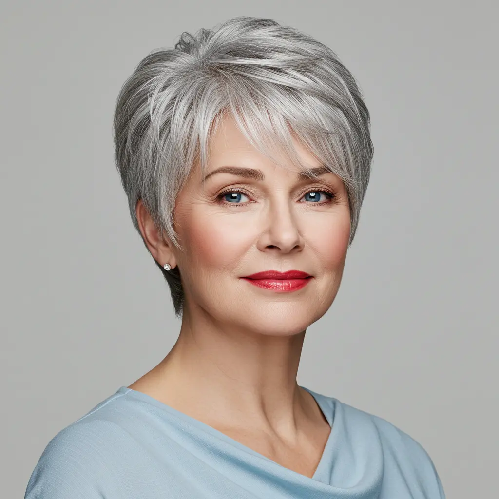 Dieser altersgerechte Pixie vereint Eleganz mit jugendlicher Energie durch sorgfältig geplante Stufen, die reife Gesichtszüge betonen und betonen. Der Schnitt geht auf häufige Probleme wie dünner werdendes Haar oder eine veränderte Textur ein und bewahrt gleichzeitig Eleganz und professionelle Ausstrahlung. Strategische Stufen sorgen für Volumen, wo es nötig ist, und sind gleichzeitig pflegeleicht und passen zu einem aktiven Lebensstil.