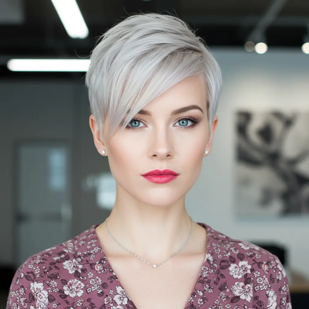 Diese moderne Interpretation besticht durch dramatische asymmetrische Linien und ein elegantes, elegantes Styling, das einen beeindruckenden visuellen Eindruck hinterlässt. Die blonde Farbe betont die architektonischen Elemente des Schnitts, während das glatte Finish raffinierten Glamour verleiht. Perfekt für Frauen, die ein starkes Style-Statement setzen und gleichzeitig Eleganz bewahren möchten.