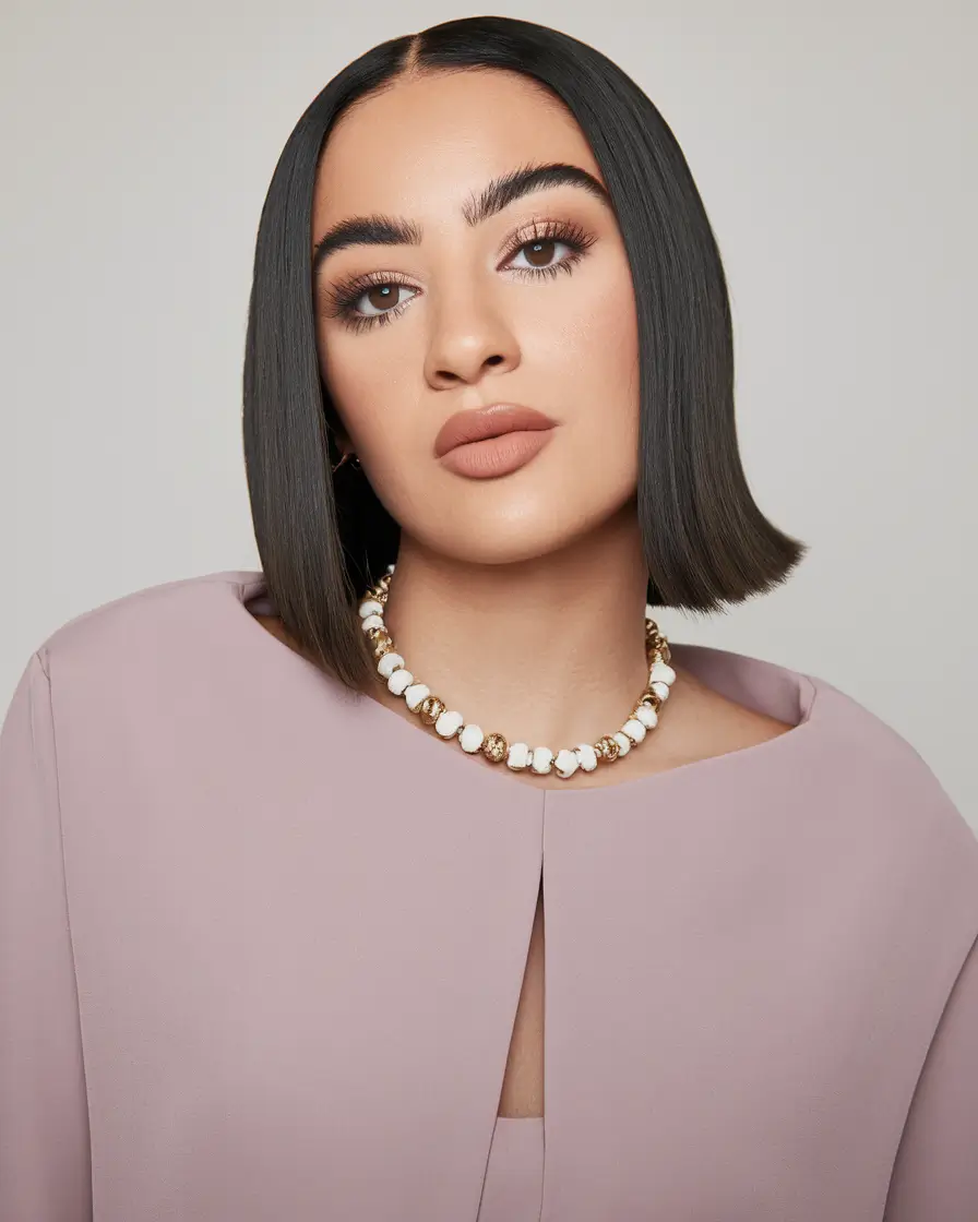 Dieser Schnitt ist Präzision pur. Dieser kurze Bob-Haarschnitt für den Herbst ist ein minimalistischer Traum mit perfekt gleichmäßigen Spitzen, einem Mittelscheitel und einem glasartigen Finish. Er wirkt cool in seinem Minimalismus und setzt in Kombination mit dichten Brauen und einem maßgeschneiderten, pastellfarbenen Oberteil mühelos ein starkes Statement. Der tiefschwarze Farbton verleiht noch mehr Geschmeidigkeit – perfekt für Frauen, die im Herbst auf auffällige Basics setzen möchten.