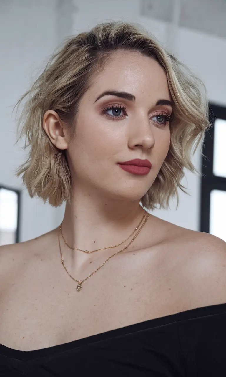 Beachy Waves sind nicht nur etwas für den Sommer. Dieser schulterlange Bob bringt die sonnengeküsste Vitalität mit etwas abgehackter Struktur und seitlichem Schwung in den Herbst. Dieser kurze Herbstschnitt verleiht dem Gesicht Volumen und Weite – besonders gut für alle, die sich etwas mehr Form wünschen, ohne gleich einen vollen, runden Bob tragen zu müssen.
