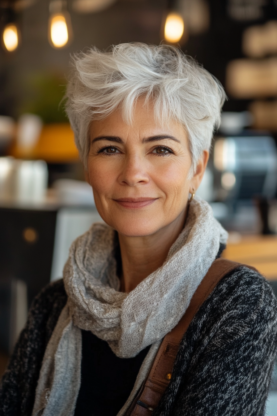Der strukturierte Kurzhaarschnitt ist eine kurze, gestufte Frisur, die dem Haar Volumen und Bewegung verleiht. Dieser Style ist perfekt für alle, die einen pflegeleichten Look mit etwas Extravaganz wünschen. Der strukturierte Kurzhaarschnitt ist nah am Kopf geschnitten und mit Stufen versehen, die für ein zerzaustes, unbeschwertes Aussehen sorgen. Er ist ideal für alle mit feinem oder schütterem Haar, da die Stufen den Eindruck von dickerem, vollerem Haar erwecken. Diese Frisur ist einfach zu stylen und kann mit etwas Texturspray oder Mousse aufgewertet werden.