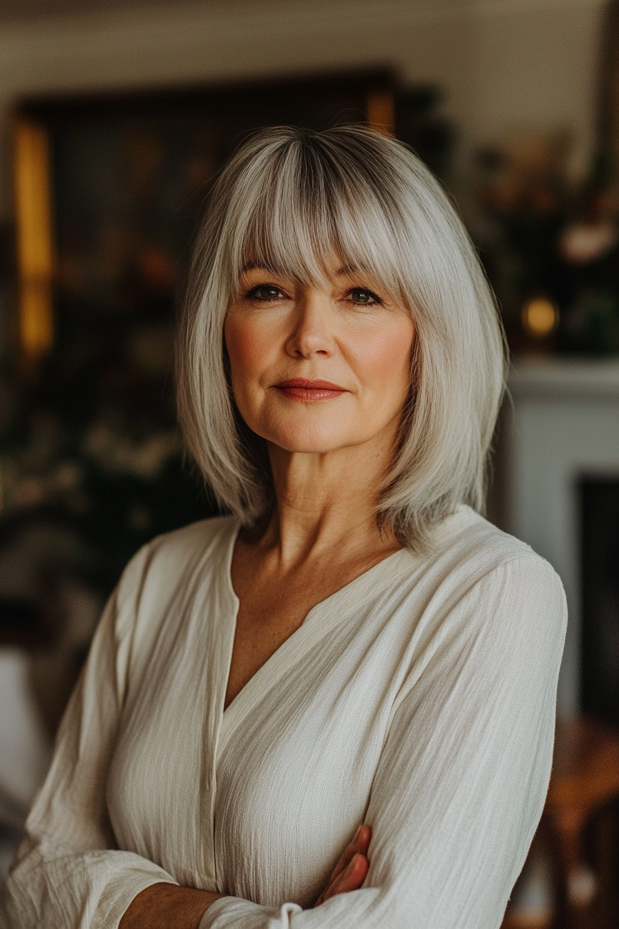Ein schulterlanger Schnitt mit Pony ist eine klassische und vielseitige Frisur, die zu vielen Gesichtsformen passt. Ein Pony verleiht der Frisur einen jugendlichen und verspielten Touch, während der schulterlange Schnitt genügend Länge für verschiedene Styling-Varianten bietet. Der Pony kann je nach Wunsch stumpf, seitlich oder dünn sein. Dieser Style passt sowohl zu glattem als auch zu welligem Haar und lässt sich durch regelmäßiges Trimmen leicht pflegen.