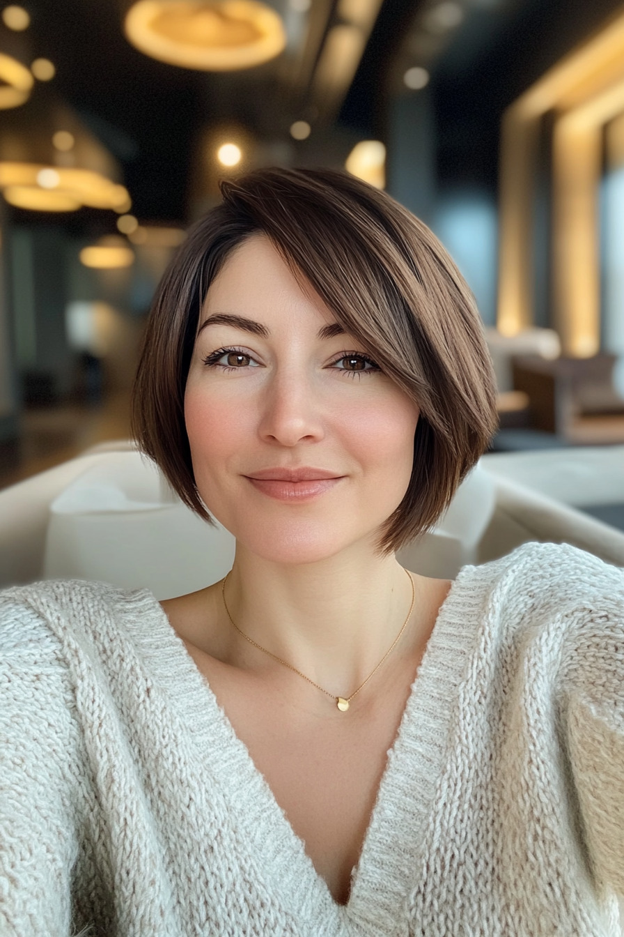 Ein kurzer Bob mit Undercut vereint Eleganz mit Extravaganz und sorgt für einen einzigartigen Look für dickes Haar. Die Seiten und der Hinterkopf sind kurz geschnitten, während das Deckhaar länger bleibt und so vielfältige Styling-Optionen bietet. Ob nach hinten gekämmt oder zerzaust – dieser Haarschnitt fällt auf. Eine mutige und zugleich praktische Wahl für alle, die eine trendige Frisur suchen.