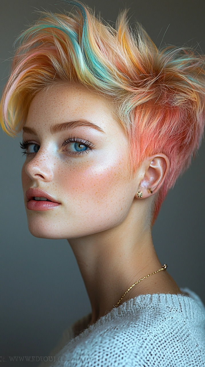 🔸 Rainbow Pixie: Eine Hommage an die Kreativität, bei der mehrere leuchtende Farben in Streifen oder Blöcken auf dem Pixie aufgetragen werden. Dieser Look ist ein Ausdruck von purer Lebensfreude und künstlerischem Flair.