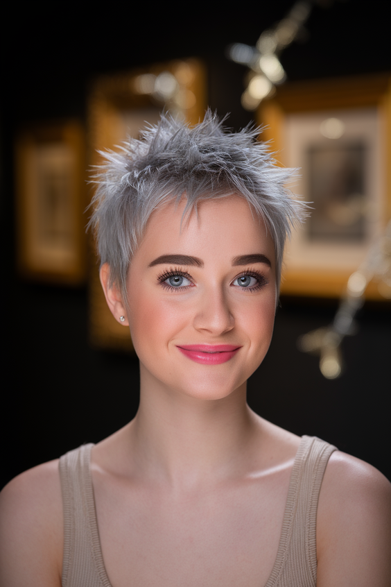 Dieser silberne Pixie strahlt eisige Attitüde aus und hat stachelige, federleichte Stufen und eine verspielte Silhouette, die sowohl punkig als auch elegant wirkt. Der silberne Farbton verleiht futuristisches Flair, doch das strahlende Make-up und das sanfte Lächeln verleihen ihm Charme und Weiblichkeit.