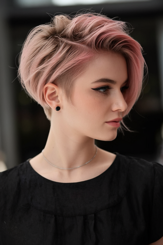 Wenn Barbiecore einen kantigen Zwilling hätte, wäre es dieser. Der zuckerwattenrosa Schwung sitzt auf einer Undercut-Basis und erzeugt einen atemberaubenden Kontrast in Farbe und Silhouette. Von der auffälligen Farbe bis zum knalligen Eyeliner – dieser Look schreit nach Glamour-Rebellin.
