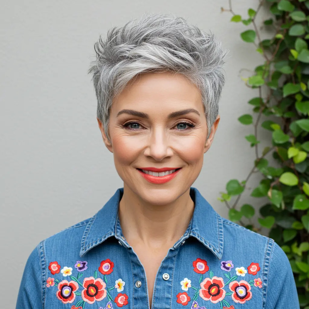 Dieser Pixie-Schnitt zelebriert natürliche Schönheit und betont den atemberaubenden Kontrast von grauem Salz-und-Pfeffer-Haar. Der strukturierte Oberkopfbereich ist so geschnitten, dass die natürliche Farbvariation hervorgehoben wird und so Tiefe und optische Spannung entsteht. Die Schnitttechnik betont die natürlichen Muster und Farben des Haares und kreiert gleichzeitig eine schmeichelhafte, moderne Form. Dieser Style ist perfekt für Frauen, die ihr natürliches Grau genießen möchten, ohne auf Stil oder Eleganz zu verzichten.