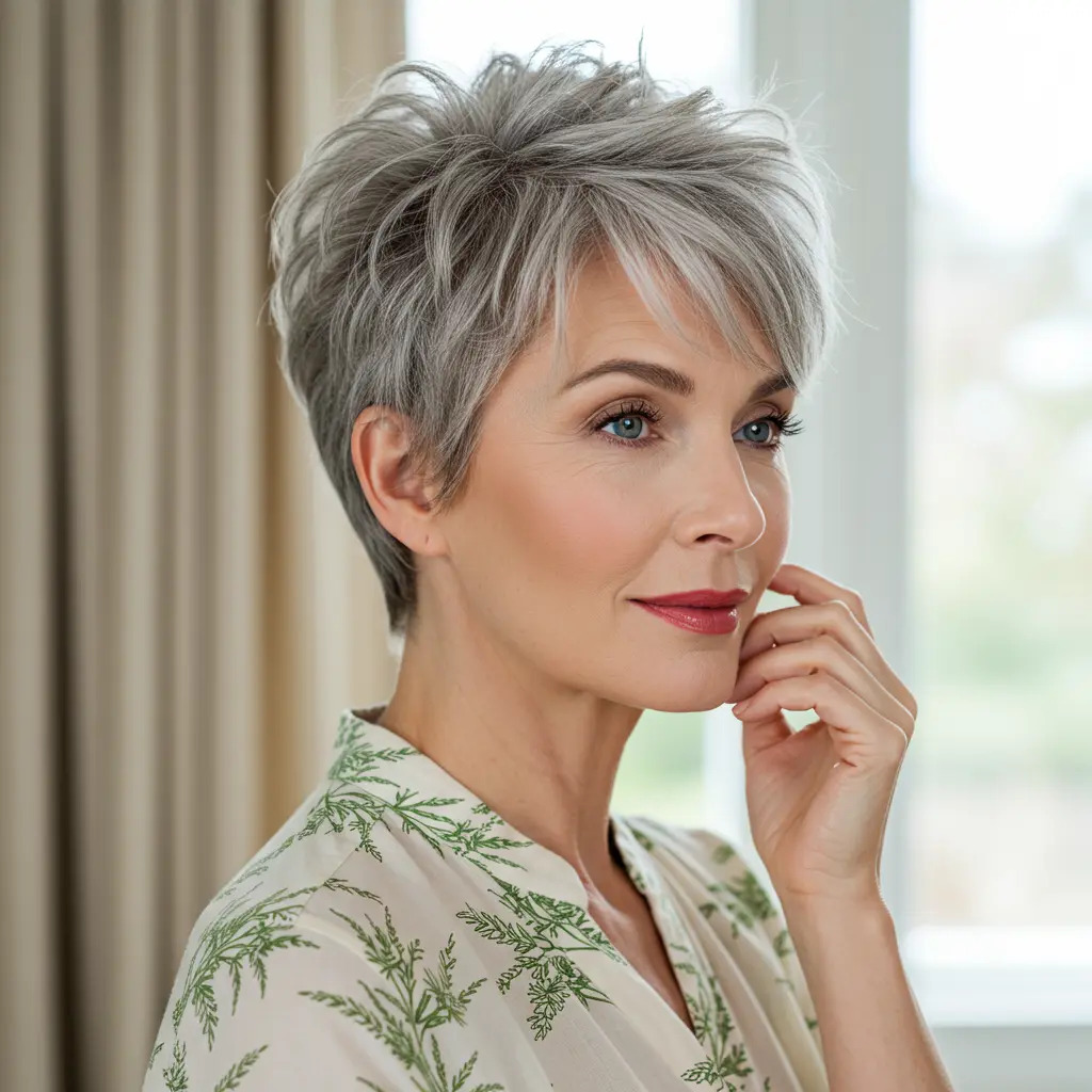 Die Textur steht im Mittelpunkt dieser dynamischen Pixie-Variante, die die natürliche Bewegung grauen Haares zelebriert. Mehrere Stufen sorgen für Dimension und Fülle, während der Pony ein jugendliches Element hinzufügt, das den Gesamtlook weicher macht. Die Texturierungstechnik umfasst Point-Cutting und Rasierklingen, um stückige, getrennte Strähnen zu kreieren, die sich mit minimalem Styling natürlich bewegen. Dieser Schnitt ist perfekt für Frauen, die die Stirnpartie etwas bedecken und gleichzeitig die Freiheit kurzen Haares genießen möchten. Der Pony kann gerade frisiert werden – für ein markantes Statement – oder seitlich geschwungen für einen weicheren Look.