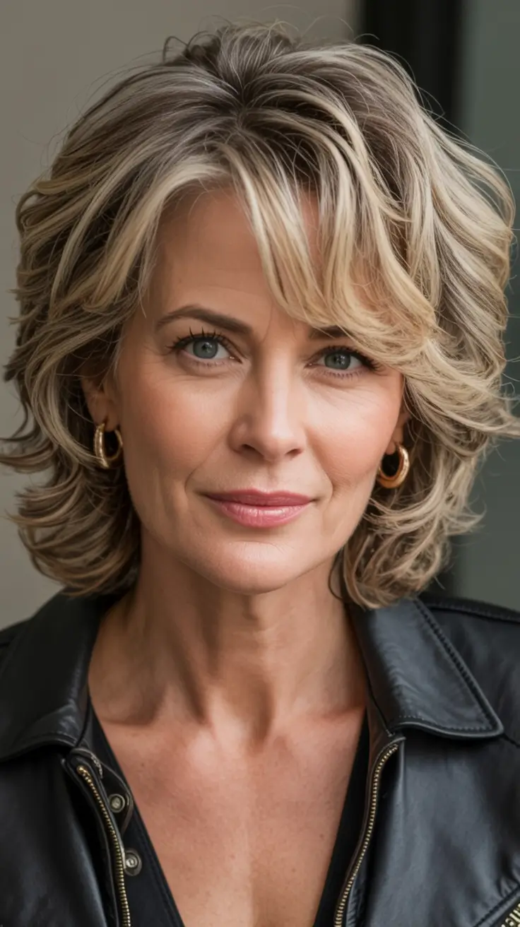 Dieser Shag ist ein echter Hingucker für alle, die sich einen mittellangen Shag mit viel Persönlichkeit wünschen – perfekt für diese honigblonde Variante. Volumen entsteht durch Stufen am Oberkopf und gefederte Spitzen, die das Haar leicht und federnd halten. Die warmen Untertöne verleihen der Haut einen goldenen Touch und eignen sich am besten für den Herbst, wenn das Licht schwächer wird.