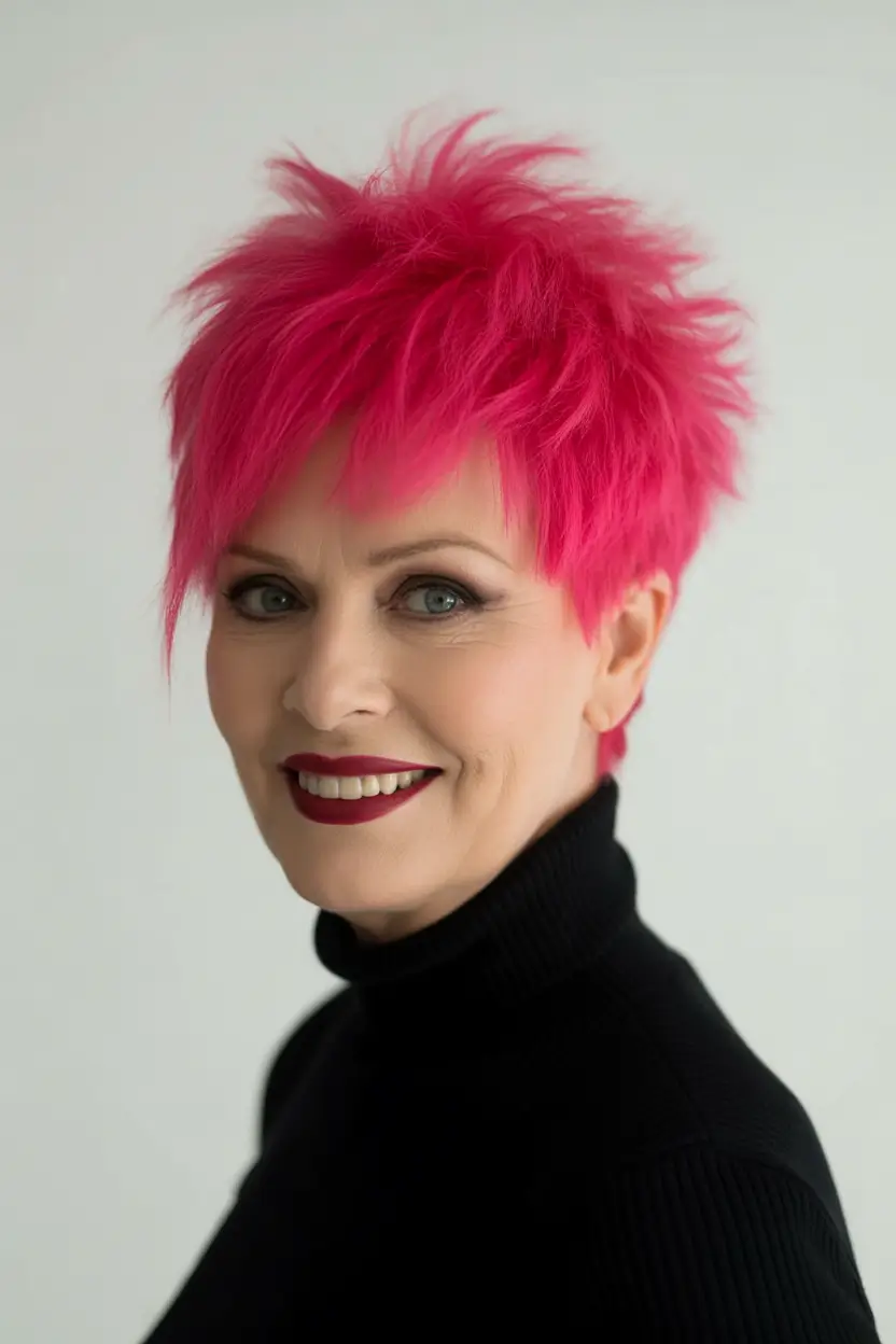 Dieser flippige Pixie steckt voller energiegeladener Musik und besticht durch Textur und mutige Farben. Die gezackten Strähnen verleihen ihm einen punkigen Touch, und das leuchtende Pink macht ihn zum Trend-Haarschnitt 2025. Er ist eine freche Alternative für alle, die den kurzen, frechen Look lieben und dennoch anders aussehen möchten.