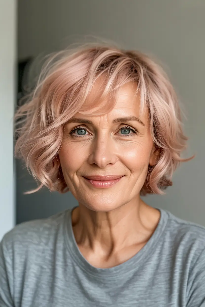 Unsere Liste darf ohne eine originelle Note nicht enden: Dieser pastellrosa, kurze, zottelige Bob erhält Textur, und sanfte Wellen verleihen ihm die nötige Farbtiefe. Er ist eine exzentrische, kurze, feminine Wahl für Frauen ab 50 und zeigt, dass eine Haarfarbe viel mehr aussagen kann als der Haarschnitt selbst.