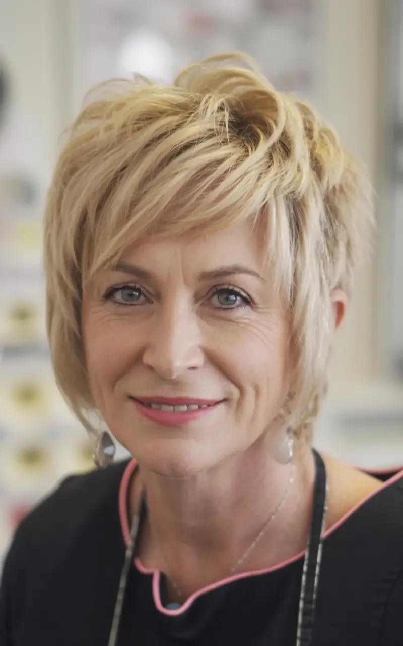 Dieser flotte, zottelige Kurzhaarschnitt besticht durch eine schöne Federung im Gesicht und einen leichten, flauschigen Schwung am Oberkopf. Er ist ein toller Schnitt für alle, die gerne große Haare tragen, aber nicht auf zu viel Länge verzichten möchten. Der Blondton ist warm genug, um den Teint sonnig wirken zu lassen, und der stufenförmige Pony verleiht der Frisur ein jugendliches Flair – ideal für den Herbst. Er gehört zu den angesagten Frisuren des Jahres 2025, ist freundlich und modisch zugleich und perfekt für alle, die gerne mit ihrem Aussehen experimentieren.