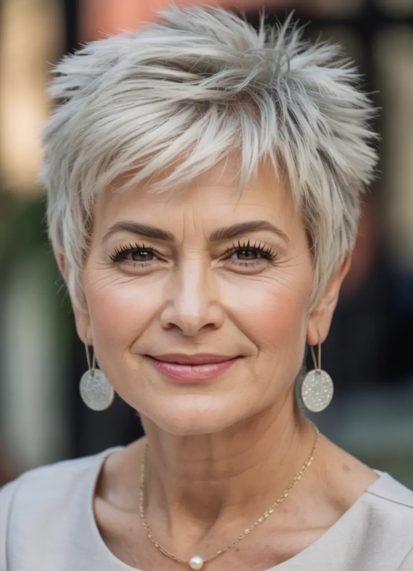 Der gewellte Pixie ähnelt weitgehend seinen Vorgängern, nur dass dieser kurze, freche silberne Pixie mit seinem längeren Pony und der toupierten Krone jetzt einen beliebteren Herbst-Look hat. Die ungleichmäßigen Stufen sorgen für sofortigen Schwung und Leichtigkeit, während die helle Silberfarbe durch die Lichtreflexion nicht altert. Er ist kantig und doch elegant und ideal für Herbstfrisuren für Frauen über 50, die Komfort und Mode vereinen.