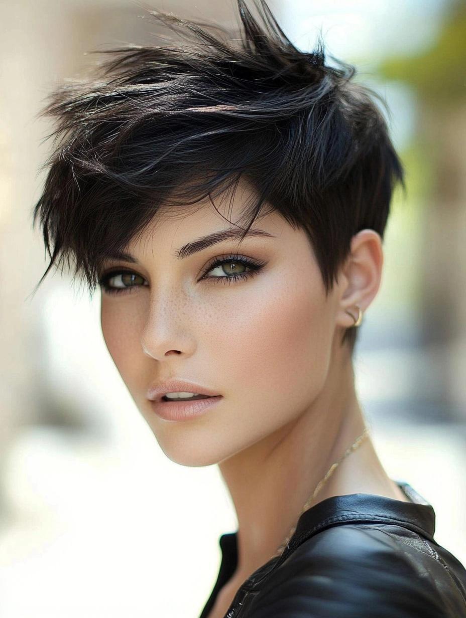 Ein kurzer Pixie-Schnitt in dunklen Tönen, der dank seines voluminösen Scheitels und der strukturierten Stufen sofort die Blicke auf sich zieht. Dieser Look betont die Gesichtszüge und sorgt für einen besonders starken und femininen Look. Diese Frisur ist ideal für Frauen, die einen mutigen, eleganten Stil suchen und ihre Individualität unterstreichen möchten.