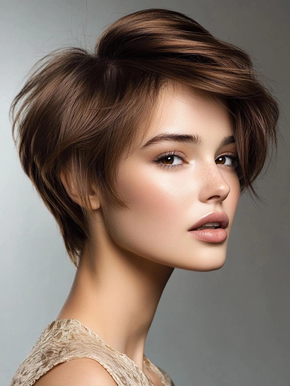 Ein kurzer, seidiger Bob mit dezenten Stufen, die dem Haar eine zarte Textur und natürlichen Glanz verleihen. Dieser Schnitt strahlt klassische Eleganz aus und eignet sich besonders für Frauen, die einen femininen und raffinierten Look suchen. Die Stufen erzeugen eine subtile Bewegung im Haar und betonen die Schlichtheit dieses Stils.