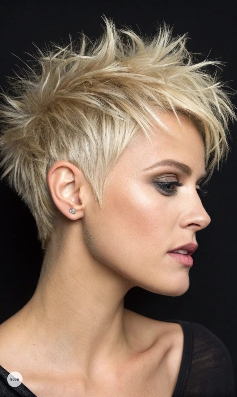 Dieser kurze, Spiky Haarschnitt für Frauen strahlt die Energie eines „coolen Mädchens“ aus. Das Platinblond und die rasiermesserscharfen Stufen erzeugen eine vom Wind zerzauste Textur, die strukturiert ist und dennoch einen unbeschwerten „Ich bin so aufgewacht“-Look ausstrahlt – ja, klar, wir wissen, dass du Haarpflege benutzt hast, aber wir lieben die Lüge.