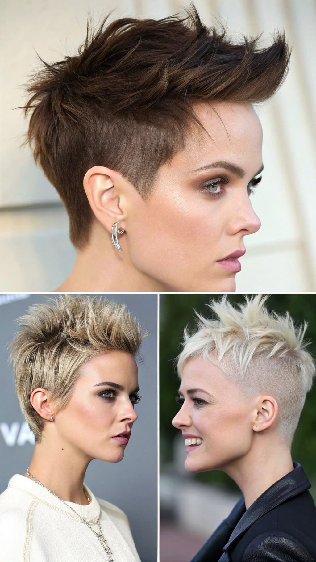 Okay, diese Collage präsentiert sich wie das Cover eines Style-Magazins – und wir sind dafür da. Das obere Bild zeigt einen kurzen, Spiky Haarschnitt im Stil von 2026 mit Power-Undercut. Unten links? Ein klassischer, chaotischer Pixie-Pony mit strukturiertem Charme. Und der Look unten rechts? Platinblond-Punk mit einem süffisanten Grinsen.