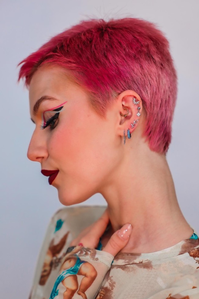 Ergänzt durch kunstvollen Eyeliner und ausgewählte Piercings ist dieser Pixie mehr als nur eine Frisur – er ist eine echte Ästhetik. Wenn Sie bereit sind, gesehen, in Erinnerung behalten und bewundert zu werden, macht diese lebendige Version des klassischen Pixies jeden Moment zu einem Statement.