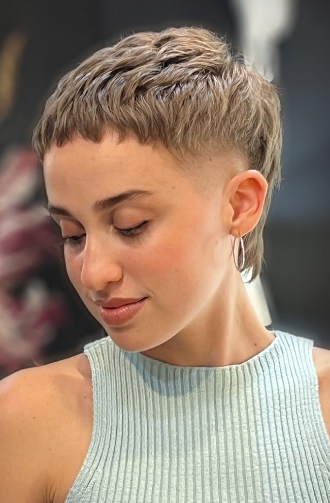 Dieser Style ist ideal für alle, die die Grenzen des klassischen Pixies erweitern möchten. Er ist jugendlich und ausdrucksstark, aber dank seines klaren Fades und der bewussten Textur dennoch perfekt poliert. Er eignet sich am besten für natürlich gewelltes oder lockiges Haar und erfordert nur minimale Pflege – nur ein Hauch Lockencreme oder definierendes Gel hält die Wellen oben in Form.
