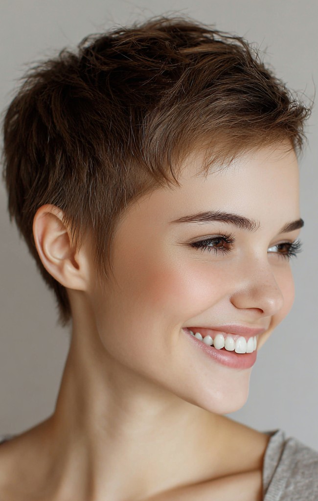 Ein frischer, zerzauster, sehr kurzer Pixie-Haarschnitt verleiht kurzen Haaren eine verspielte, jugendliche Note. Luftige Stufen und feine Spitzen verleihen Bewegung und Weichheit und sorgen für einen mühelos schicken Look, der gleichzeitig zugänglich und modern ist. Das dezente Volumen am Oberkopf und im Gesicht schmeichelt ovalen und herzförmigen Gesichtszügen und verleiht dem Schnitt eine leichte, ausgewogene Silhouette. Mit etwas Schaumfestiger oder Trockentexturspray lässt er sich leicht stylen und ist ideal für pflegeleichte Routinen. Der warme Braunton betont den natürlichen Fluss, ohne die Form zu überladen. Dieser Pixie ist perfekt für alle, die einen lässigen, eleganten und verspielten Look wünschen.