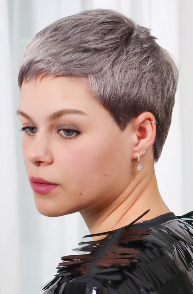 Cool, clean und dezent dominant – der silberne Smoky Pixie ist ein moderner Klassiker mit dem gewissen Etwas. Die eisigen Lavendel-Grautöne verleihen dem zeitlosen Schnitt eine ultramoderne Note, während die weiche Textur und der präzise Schnitt für mühelose Tragbarkeit sorgen. Er ist glatt, ohne streng zu wirken, und stylisch, ohne sich zu sehr anzustrengen.