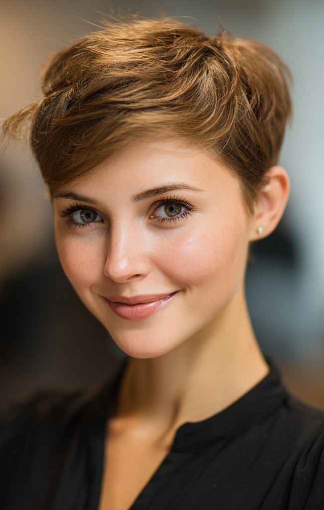 Ein seitlich geschwungener, gestufter, sehr kurzer Pixie-Haarschnitt verleiht einem traditionell gewagten Stil einen romantischen, femininen Charme. Längere Strähnen, die sanft über die Stirn fallen, verleihen Weichheit und Bewegung und erzeugen gleichzeitig die Illusion von Fülle. Die spitz zulaufenden Seiten sorgen für eine klare Struktur und gleichen die luftigen Stufen oben wunderbar aus. Der seitlich geschwungene Pony ist ideal für runde und ovale Gesichtsformen. Er streckt die Gesichtszüge und lenkt den Fokus auf die Augen. Mit leichtem Schaum gestylt und mit den Fingern getrocknet für ein natürliches Finish, ist dieser Schnitt pflegeleicht und dennoch elegant. Der erdige Kastanienton sorgt für Wärme und macht diesen Pixie perfekt für alle, die Eleganz mit einem modernen Touch suchen.