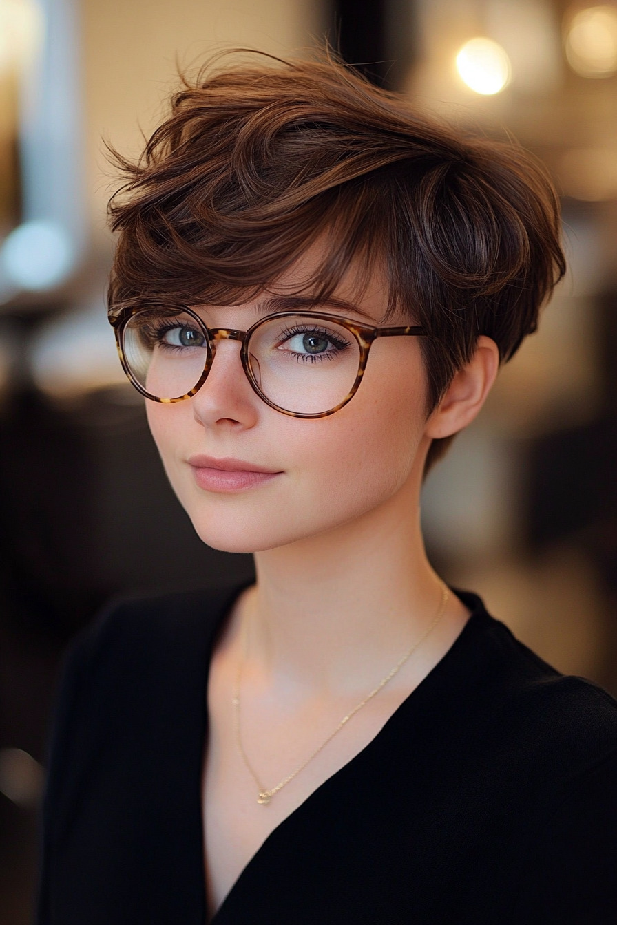 Ein abgerundeter Pixie-Schnitt sorgt für ein weiches und feminines Aussehen und unterstreicht die natürliche Textur feinen Haares. Die runde Form verstärkt das Volumen am Oberkopf und hält das Haar gleichzeitig nah am Kopf für ein schickes Finish. Dieser Stil ist besonders attraktiv für alle, die eine süße und zugleich stylische Option suchen.